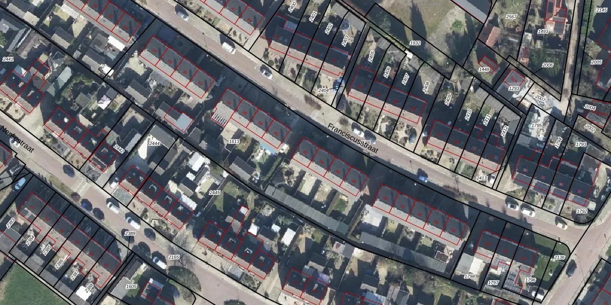 Het perceel waarop Franciscusstraat 42 staat heeft een oppervlakte van 3530 m². Dit is een zeer groot perceel. De perceeloppervlakte wordt geregistreerd door het Kadaster. Gedetailleerde informatie over de maten van dit perceel kunt u vinden in het rapport Kadastrale kaart met maatvoering van Franciscusstraat 42.