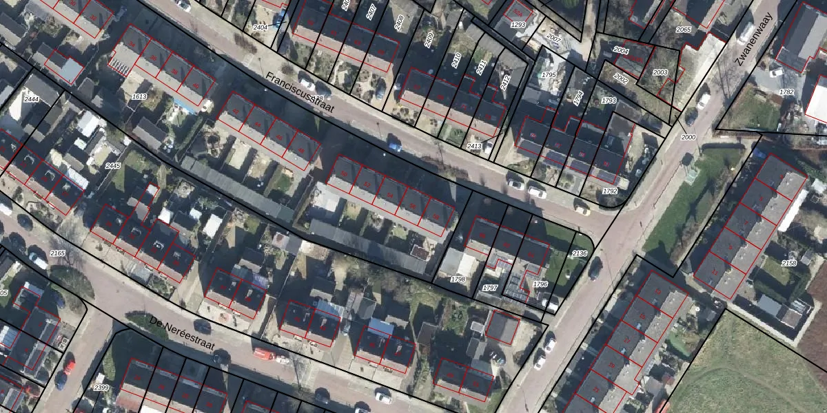 Het perceel waarop Franciscusstraat 56 staat heeft een oppervlakte van 3530 m². Dit is een zeer groot perceel. De perceeloppervlakte wordt geregistreerd door het Kadaster. Gedetailleerde informatie over de maten van dit perceel kunt u vinden in het rapport Kadastrale kaart met maatvoering van Franciscusstraat 56.