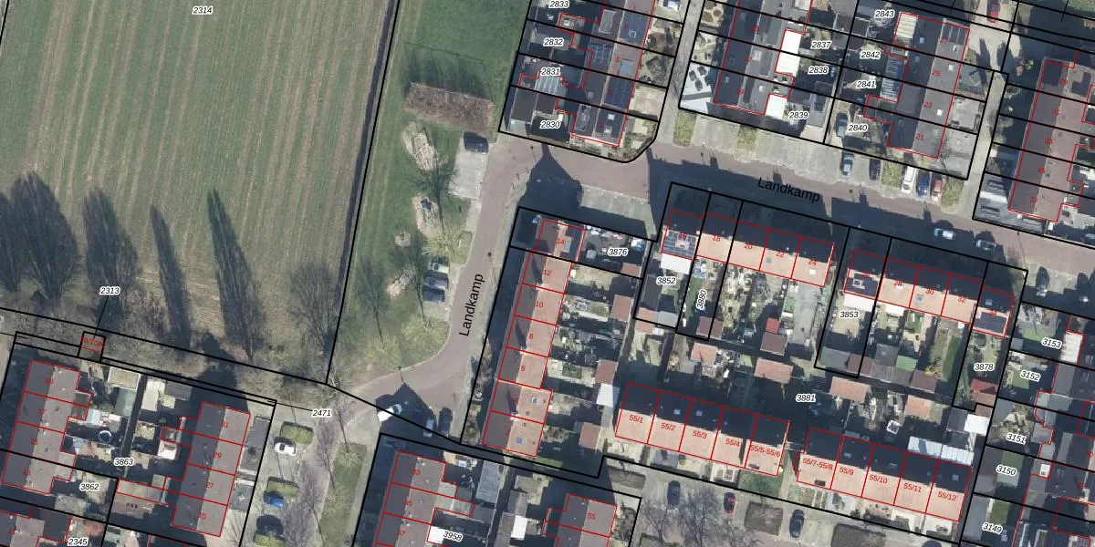 Het perceel waarop Landkamp 12 staat heeft een oppervlakte van 3655 m². Dit is een zeer groot perceel. De perceeloppervlakte wordt geregistreerd door het Kadaster. Gedetailleerde informatie over de maten van dit perceel kunt u vinden in het rapport Kadastrale kaart met maatvoering van Landkamp 12.