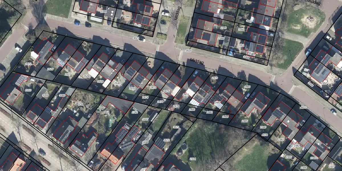 Het perceel waarop Middag 14 staat heeft een oppervlakte van 199 m². Dit is een middelgroot perceel. De perceeloppervlakte wordt geregistreerd door het Kadaster. Gedetailleerde informatie over de maten van dit perceel kunt u vinden in het rapport Kadastrale kaart met maatvoering van Middag 14.