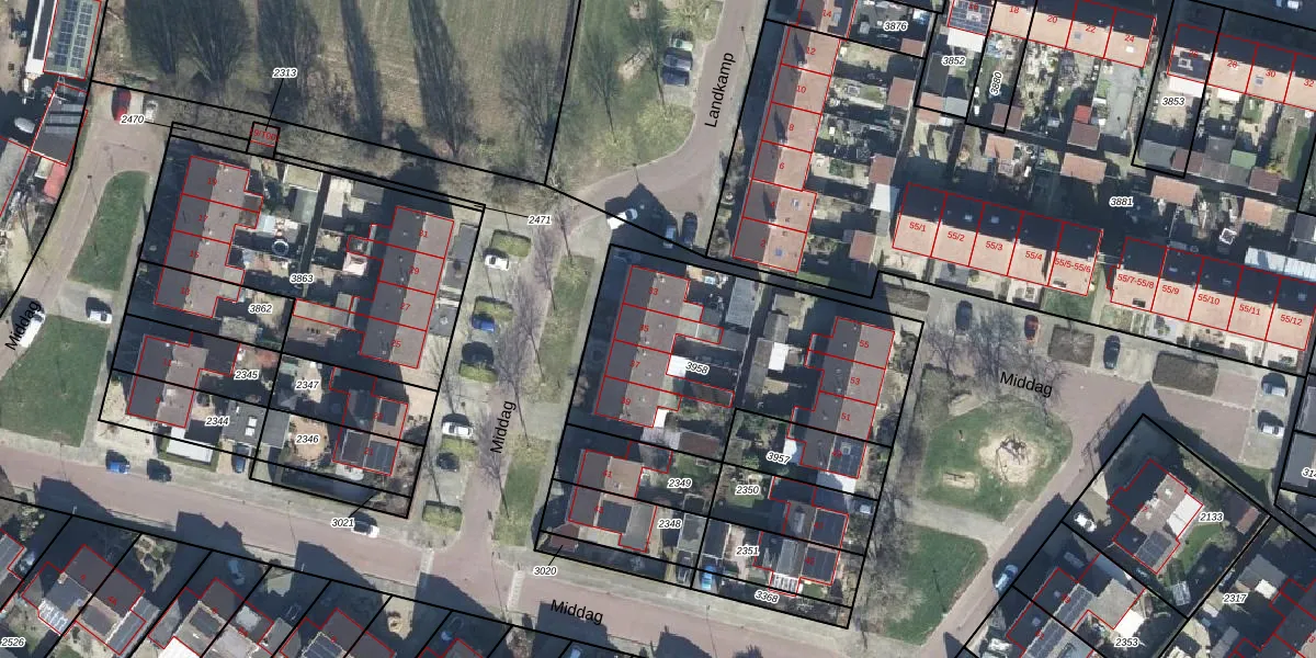 Het perceel waarop Middag 35 staat heeft een oppervlakte van 1172 m². Dit is een zeer groot perceel. De perceeloppervlakte wordt geregistreerd door het Kadaster. Gedetailleerde informatie over de maten van dit perceel kunt u vinden in het rapport Kadastrale kaart met maatvoering van Middag 35.