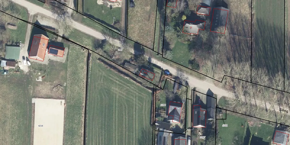 Het perceel waarop Sleeg 24-A staat heeft een oppervlakte van 3,1 ha. Dit is een zeer groot perceel. De perceeloppervlakte wordt geregistreerd door het Kadaster. Gedetailleerde informatie over de maten van dit perceel kunt u vinden in het rapport Kadastrale kaart met maatvoering van Sleeg 24-A.