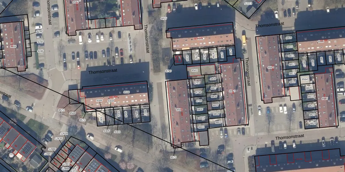 Het perceel waarop Thomsonstraat 165 staat heeft een oppervlakte van 565 m². Dit is een groot perceel. De perceeloppervlakte wordt geregistreerd door het Kadaster. Gedetailleerde informatie over de maten van dit perceel kunt u vinden in het rapport Kadastrale kaart met maatvoering van Thomsonstraat 165.