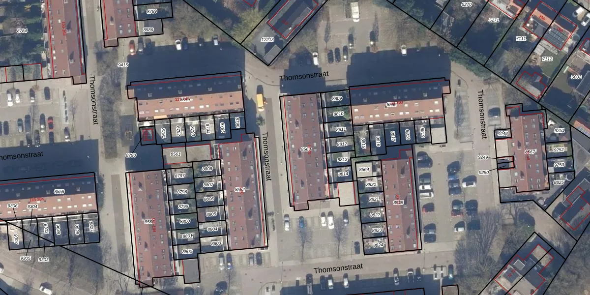 Het perceel waarop Thomsonstraat 24 staat heeft een oppervlakte van 589 m². Dit is een groot perceel. De perceeloppervlakte wordt geregistreerd door het Kadaster. Gedetailleerde informatie over de maten van dit perceel kunt u vinden in het rapport Kadastrale kaart met maatvoering van Thomsonstraat 24.