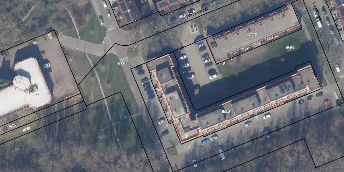 Het perceel waarop Windestraat 100 staat heeft een oppervlakte van 2008 m². Dit is een zeer groot perceel. De perceeloppervlakte wordt geregistreerd door het Kadaster. Gedetailleerde informatie over de maten van dit perceel kunt u vinden in het rapport Kadastrale kaart met maatvoering van Windestraat 100.