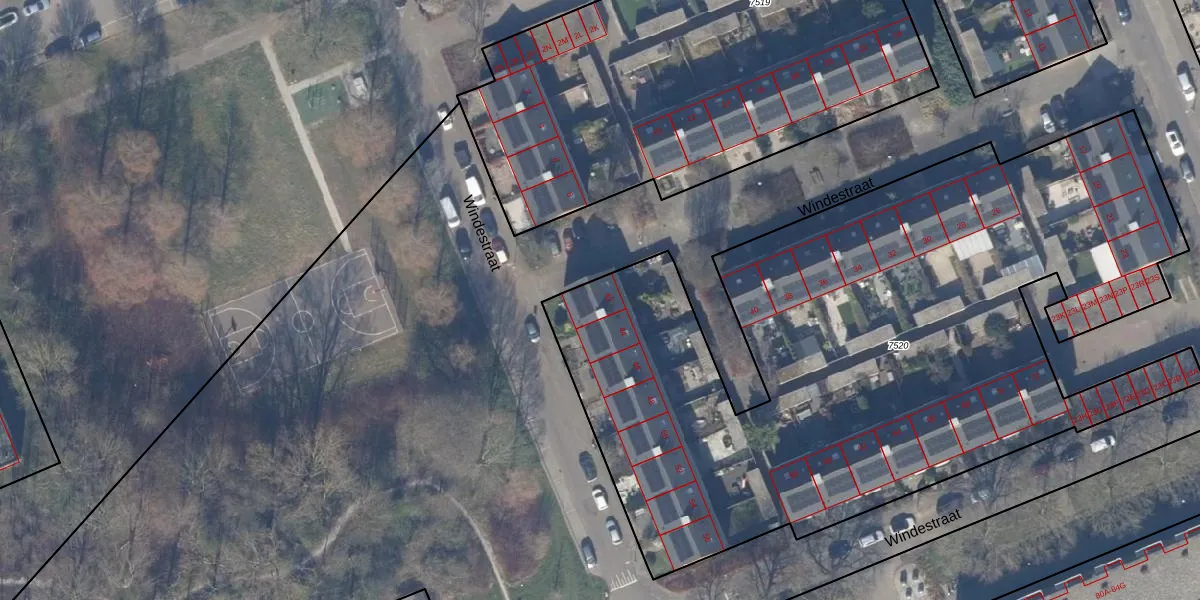 Het perceel waarop Windestraat 42 staat heeft een oppervlakte van 4438 m². Dit is een zeer groot perceel. De perceeloppervlakte wordt geregistreerd door het Kadaster. Gedetailleerde informatie over de maten van dit perceel kunt u vinden in het rapport Kadastrale kaart met maatvoering van Windestraat 42.