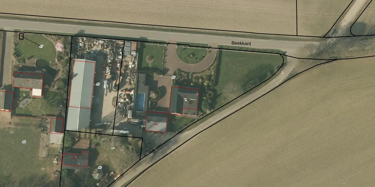 Het perceel waarop Beekkant 13 staat heeft een oppervlakte van 3263 m². Dit is een zeer groot perceel. De perceeloppervlakte wordt geregistreerd door het Kadaster. Gedetailleerde informatie over de maten van dit perceel kunt u vinden in het rapport Kadastrale kaart met maatvoering van Beekkant 13.