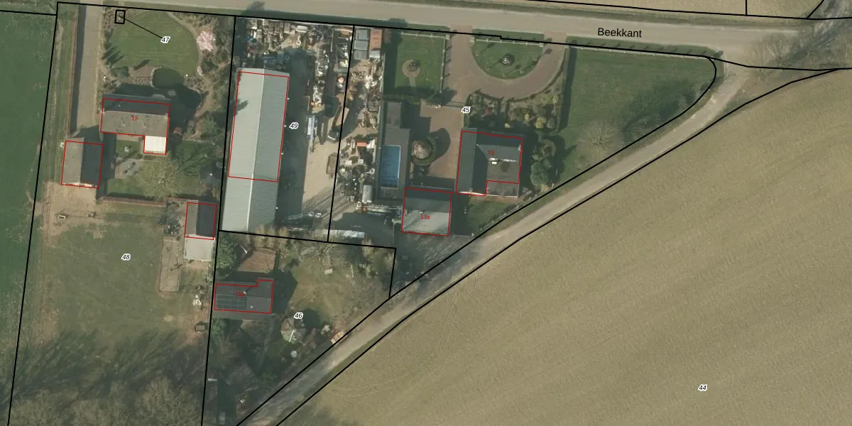 Het perceel waarop Beekkant 13-a staat heeft een oppervlakte van 3263 m². Dit is een zeer groot perceel. De perceeloppervlakte wordt geregistreerd door het Kadaster. Gedetailleerde informatie over de maten van dit perceel kunt u vinden in het rapport Kadastrale kaart met maatvoering van Beekkant 13-a.