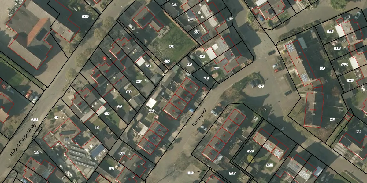 Het perceel waarop Genroyhof 29 staat heeft een oppervlakte van 1273 m². Dit is een zeer groot perceel. De perceeloppervlakte wordt geregistreerd door het Kadaster. Gedetailleerde informatie over de maten van dit perceel kunt u vinden in het rapport Kadastrale kaart met maatvoering van Genroyhof 29.