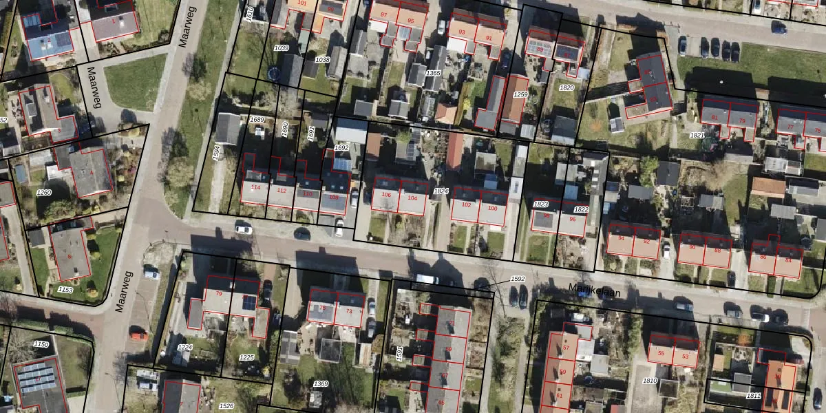 Het perceel waarop Marijkelaan 104 staat heeft een oppervlakte van 1142 m². Dit is een zeer groot perceel. De perceeloppervlakte wordt geregistreerd door het Kadaster. Gedetailleerde informatie over de maten van dit perceel kunt u vinden in het rapport Kadastrale kaart met maatvoering van Marijkelaan 104.