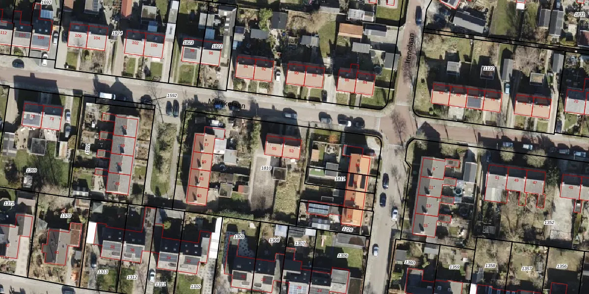 Het perceel waarop Marijkelaan 53 staat heeft een oppervlakte van 1941 m². Dit is een zeer groot perceel. De perceeloppervlakte wordt geregistreerd door het Kadaster. Gedetailleerde informatie over de maten van dit perceel kunt u vinden in het rapport Kadastrale kaart met maatvoering van Marijkelaan 53.