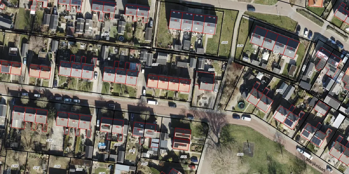 Het perceel waarop Marijkelaan 54 staat heeft een oppervlakte van 2200 m². Dit is een zeer groot perceel. De perceeloppervlakte wordt geregistreerd door het Kadaster. Gedetailleerde informatie over de maten van dit perceel kunt u vinden in het rapport Kadastrale kaart met maatvoering van Marijkelaan 54.