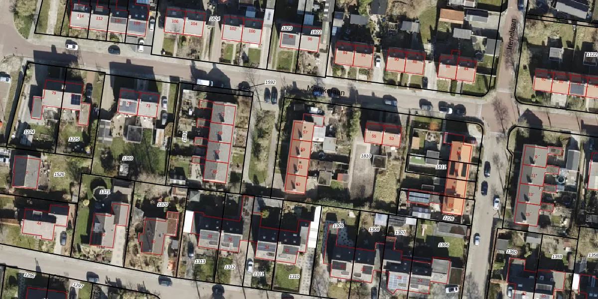 Het perceel waarop Marijkelaan 59 staat heeft een oppervlakte van 1941 m². Dit is een zeer groot perceel. De perceeloppervlakte wordt geregistreerd door het Kadaster. Gedetailleerde informatie over de maten van dit perceel kunt u vinden in het rapport Kadastrale kaart met maatvoering van Marijkelaan 59.