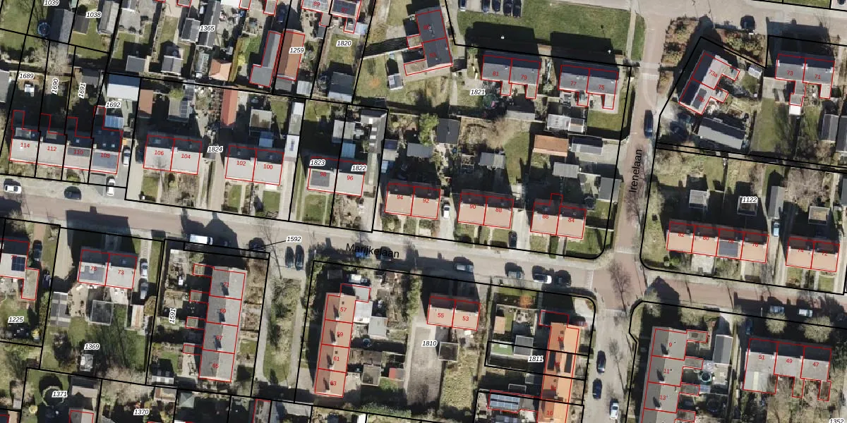 Het perceel waarop Marijkelaan 92 staat heeft een oppervlakte van 2896 m². Dit is een zeer groot perceel. De perceeloppervlakte wordt geregistreerd door het Kadaster. Gedetailleerde informatie over de maten van dit perceel kunt u vinden in het rapport Kadastrale kaart met maatvoering van Marijkelaan 92.