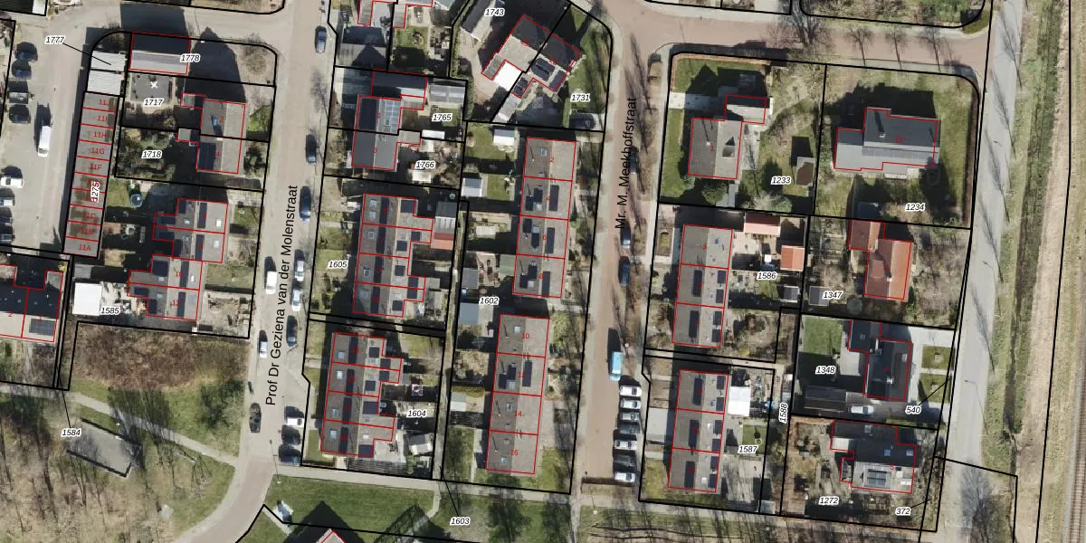 Het perceel waarop Mr. M. Meekhoffstraat 8 staat heeft een oppervlakte van 1603 m². Dit is een zeer groot perceel. De perceeloppervlakte wordt geregistreerd door het Kadaster. Gedetailleerde informatie over de maten van dit perceel kunt u vinden in het rapport Kadastrale kaart met maatvoering van Mr. M. Meekhoffstraat 8.