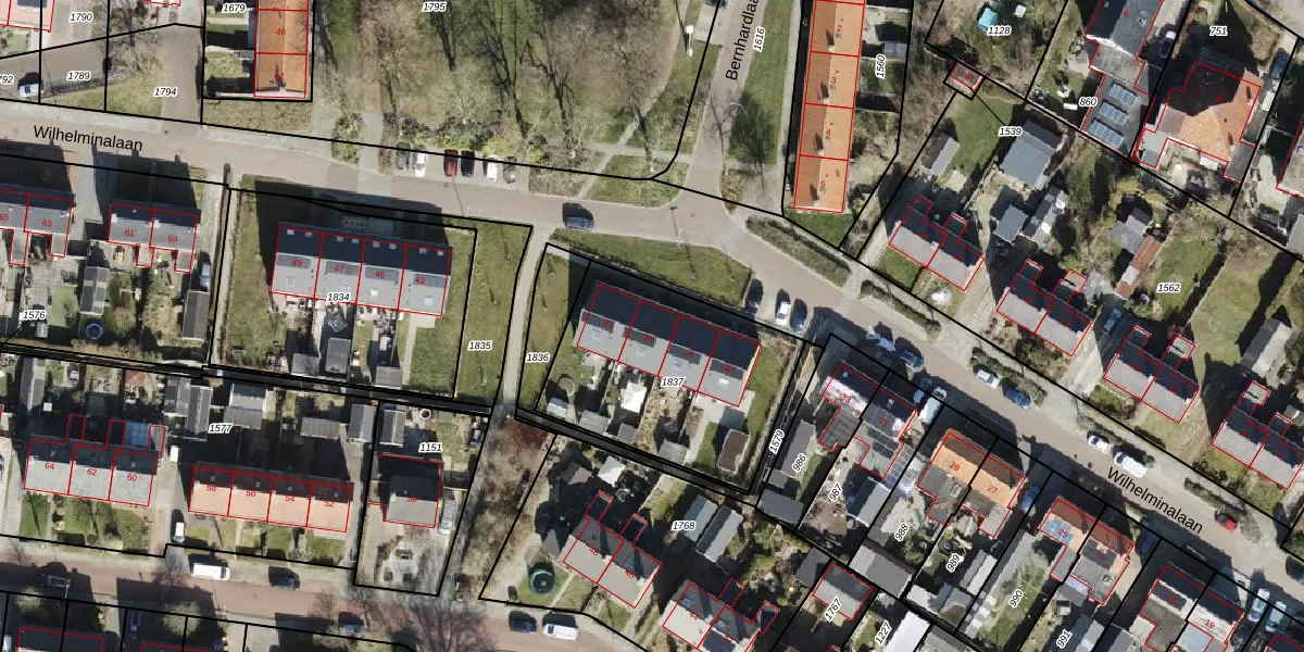Het perceel waarop Wilhelminalaan 39 staat heeft een oppervlakte van 875 m². Dit is een groot perceel. De perceeloppervlakte wordt geregistreerd door het Kadaster. Gedetailleerde informatie over de maten van dit perceel kunt u vinden in het rapport Kadastrale kaart met maatvoering van Wilhelminalaan 39.