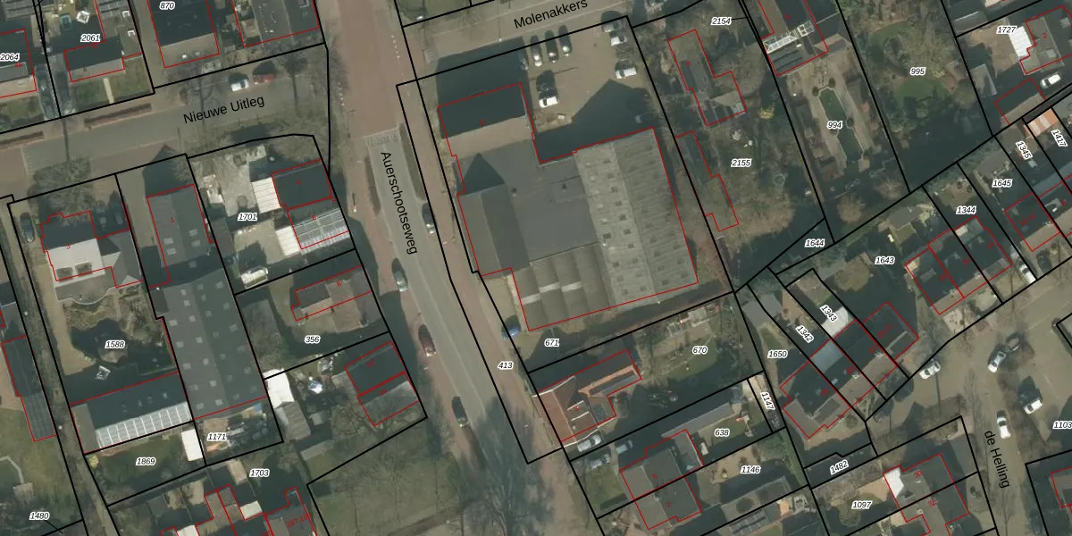 Het perceel waarop Auerschootseweg 1-w staat heeft een oppervlakte van 2405 m². Dit is een zeer groot perceel. De perceeloppervlakte wordt geregistreerd door het Kadaster. Gedetailleerde informatie over de maten van dit perceel kunt u vinden in het rapport Kadastrale kaart met maatvoering van Auerschootseweg 1-w.