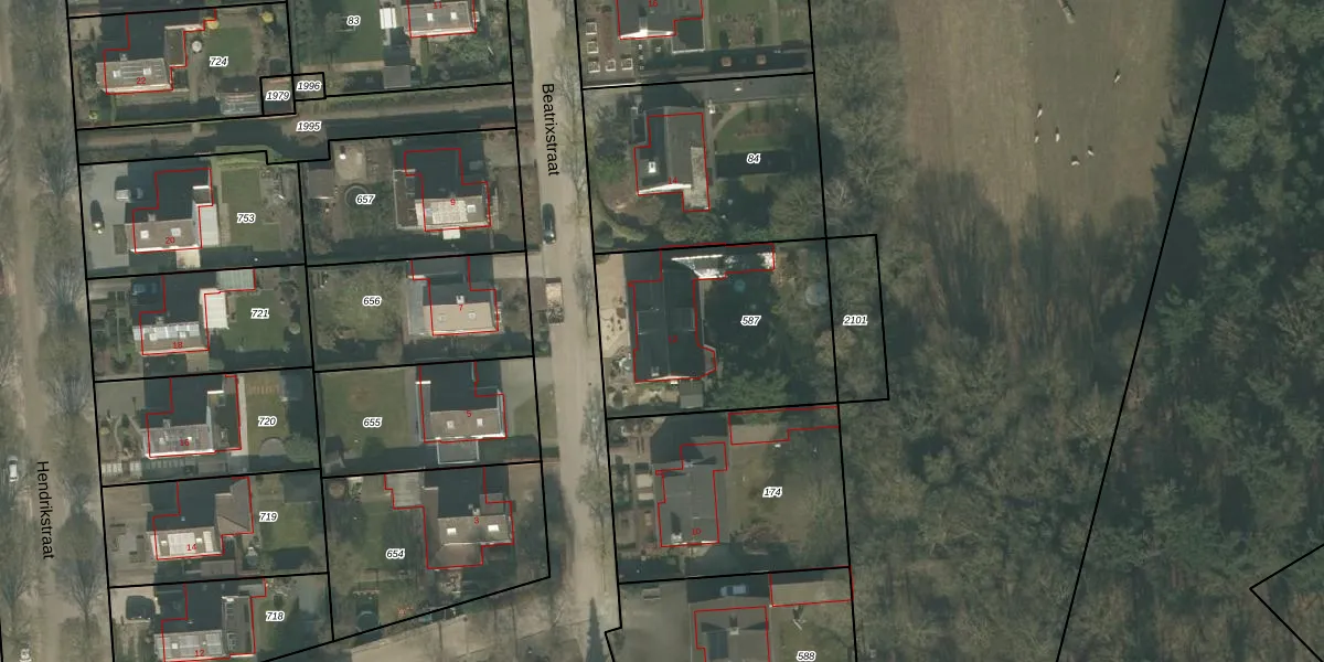 Het perceel waarop Beatrixstraat 12 staat heeft een oppervlakte van 874 m². Dit is een groot perceel. De perceeloppervlakte wordt geregistreerd door het Kadaster. Gedetailleerde informatie over de maten van dit perceel kunt u vinden in het rapport Kadastrale kaart met maatvoering van Beatrixstraat 12.