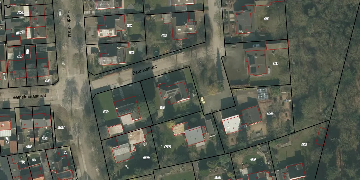 Het perceel waarop Beatrixstraat 2 staat heeft een oppervlakte van 730 m². Dit is een groot perceel. De perceeloppervlakte wordt geregistreerd door het Kadaster. Gedetailleerde informatie over de maten van dit perceel kunt u vinden in het rapport Kadastrale kaart met maatvoering van Beatrixstraat 2.
