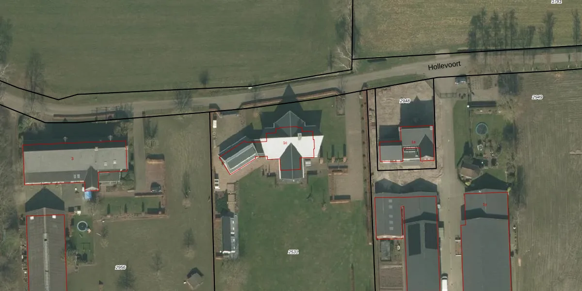 Het perceel waarop Hollevoort 1-c staat heeft een oppervlakte van 6000 m². Dit is een zeer groot perceel. De perceeloppervlakte wordt geregistreerd door het Kadaster. Gedetailleerde informatie over de maten van dit perceel kunt u vinden in het rapport Kadastrale kaart met maatvoering van Hollevoort 1-c.