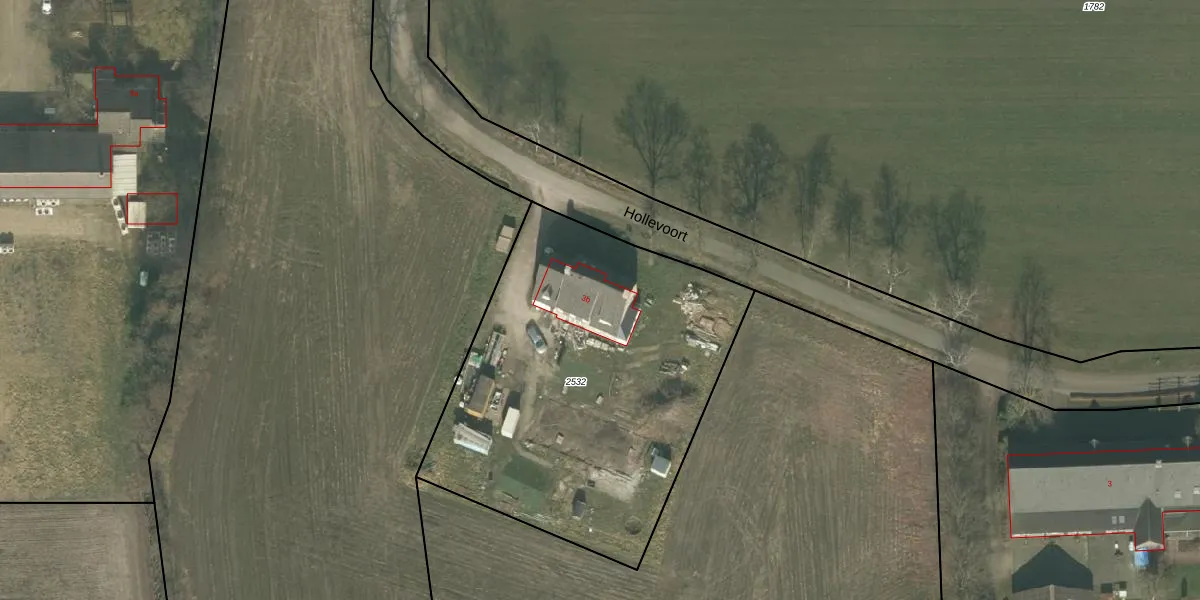 Het perceel waarop Hollevoort 3-b staat heeft een oppervlakte van 2005 m². Dit is een zeer groot perceel. De perceeloppervlakte wordt geregistreerd door het Kadaster. Gedetailleerde informatie over de maten van dit perceel kunt u vinden in het rapport Kadastrale kaart met maatvoering van Hollevoort 3-b.