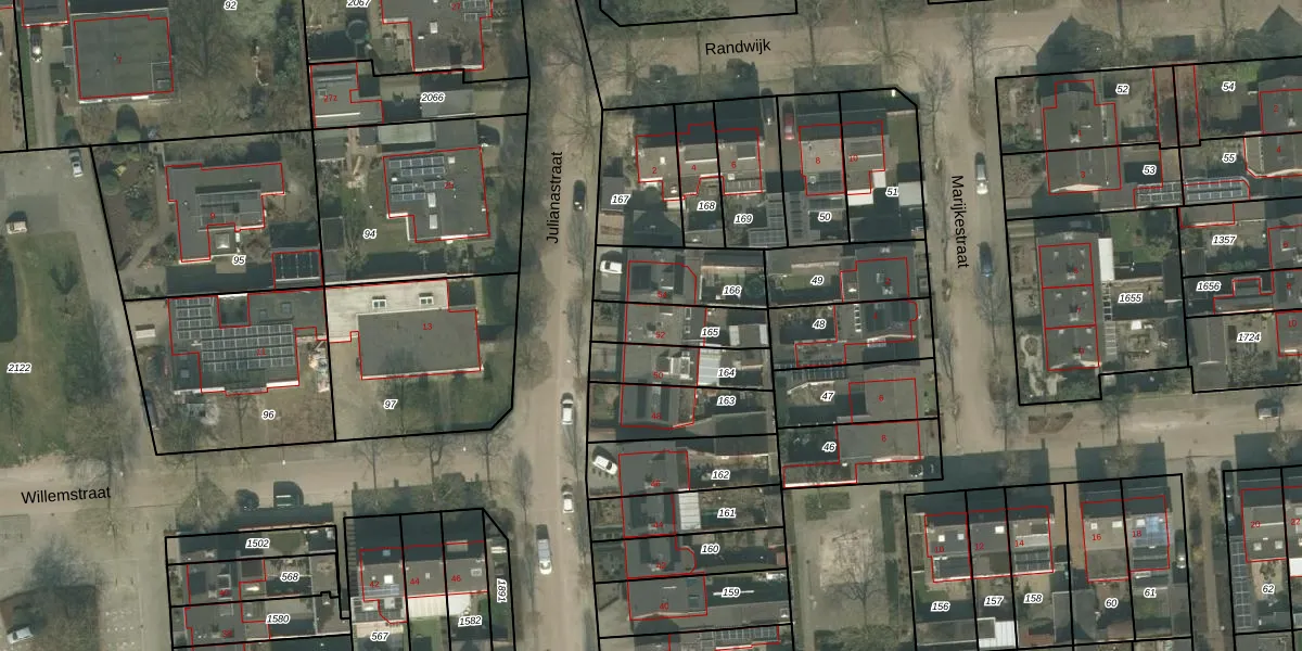 Het perceel waarop Julianastraat 52 staat heeft een oppervlakte van 170 m². Dit is een middelgroot perceel. De perceeloppervlakte wordt geregistreerd door het Kadaster. Gedetailleerde informatie over de maten van dit perceel kunt u vinden in het rapport Kadastrale kaart met maatvoering van Julianastraat 52.