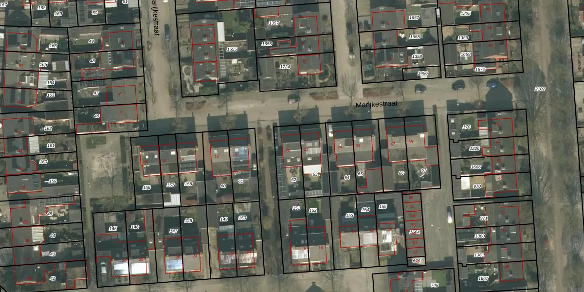 Het perceel waarop Marijkestraat 20 staat heeft een oppervlakte van 225 m². Dit is een middelgroot perceel. De perceeloppervlakte wordt geregistreerd door het Kadaster. Gedetailleerde informatie over de maten van dit perceel kunt u vinden in het rapport Kadastrale kaart met maatvoering van Marijkestraat 20.