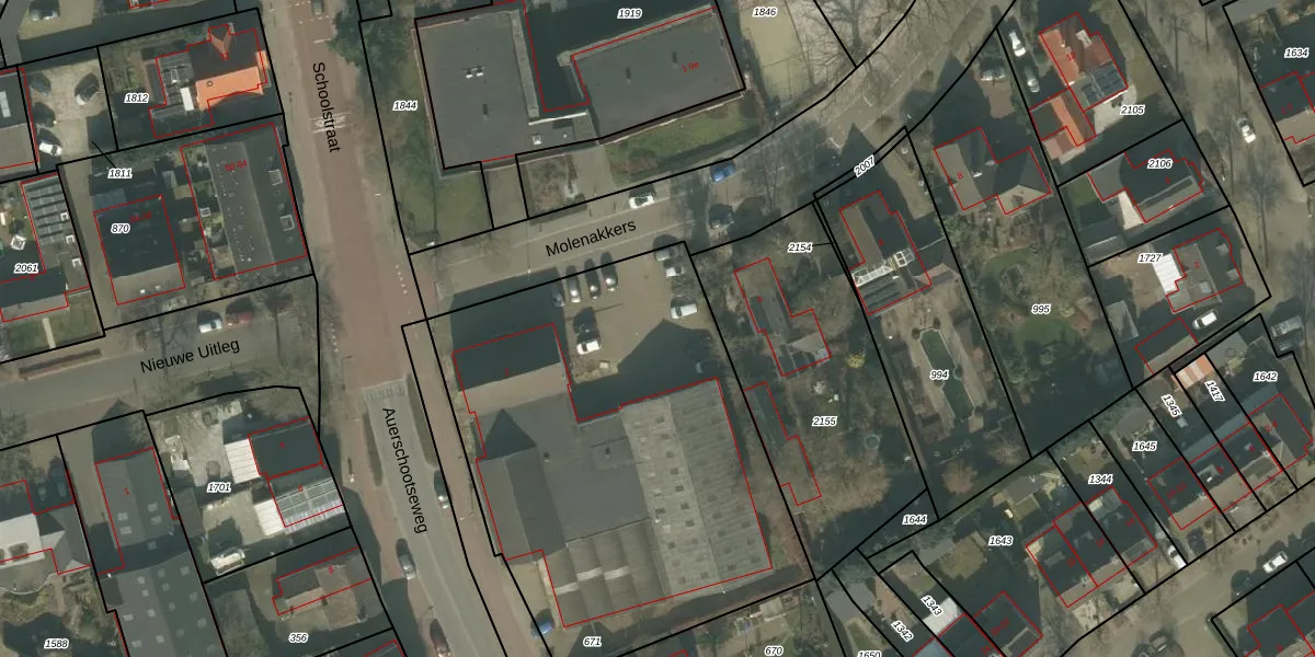 Het perceel waarop Molenakkers 2-p staat heeft een oppervlakte van 2405 m². Dit is een zeer groot perceel. De perceeloppervlakte wordt geregistreerd door het Kadaster. Gedetailleerde informatie over de maten van dit perceel kunt u vinden in het rapport Kadastrale kaart met maatvoering van Molenakkers 2-p.