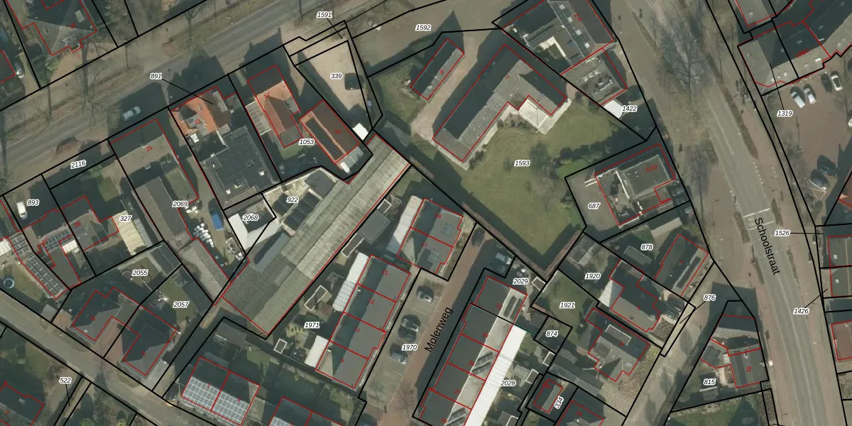 Het perceel waarop Molenweg 19 staat heeft een oppervlakte van 2032 m². Dit is een zeer groot perceel. De perceeloppervlakte wordt geregistreerd door het Kadaster. Gedetailleerde informatie over de maten van dit perceel kunt u vinden in het rapport Kadastrale kaart met maatvoering van Molenweg 19.