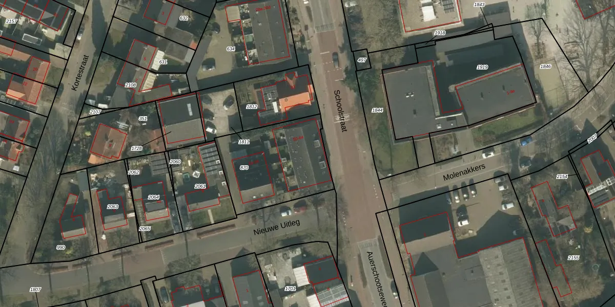 Het perceel waarop Schoolstraat 52 staat heeft een oppervlakte van 869 m². Dit is een groot perceel. De perceeloppervlakte wordt geregistreerd door het Kadaster. Gedetailleerde informatie over de maten van dit perceel kunt u vinden in het rapport Kadastrale kaart met maatvoering van Schoolstraat 52.