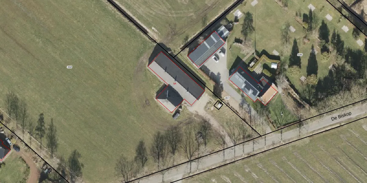 Het perceel waarop De Biskop 9-A staat heeft een oppervlakte van 1,2 ha. Dit is een zeer groot perceel. De perceeloppervlakte wordt geregistreerd door het Kadaster. Gedetailleerde informatie over de maten van dit perceel kunt u vinden in het rapport Kadastrale kaart met maatvoering van De Biskop 9-A.