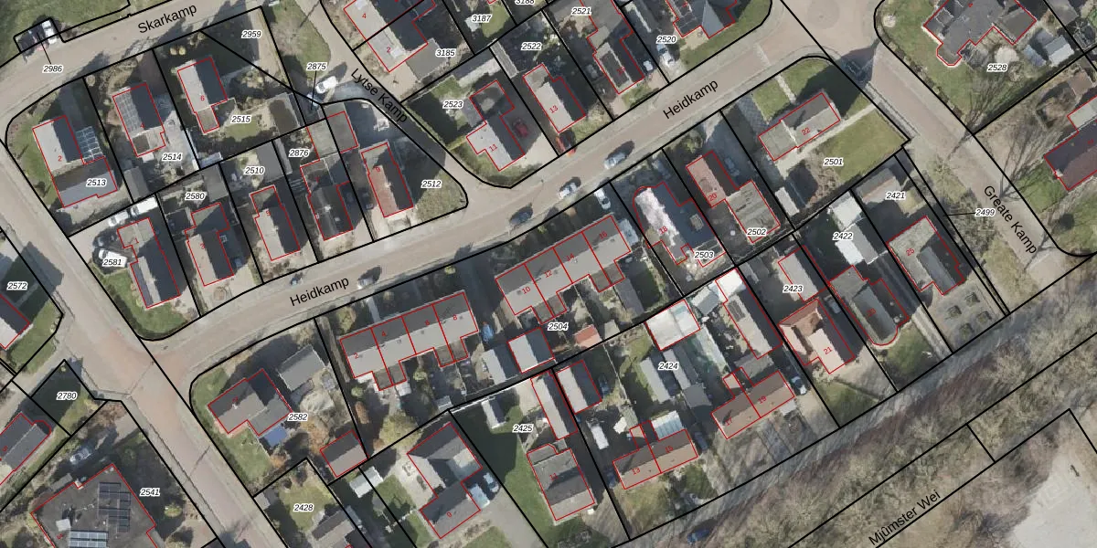 Het perceel waarop Heidkamp 12 staat heeft een oppervlakte van 1555 m². Dit is een zeer groot perceel. De perceeloppervlakte wordt geregistreerd door het Kadaster. Gedetailleerde informatie over de maten van dit perceel kunt u vinden in het rapport Kadastrale kaart met maatvoering van Heidkamp 12.