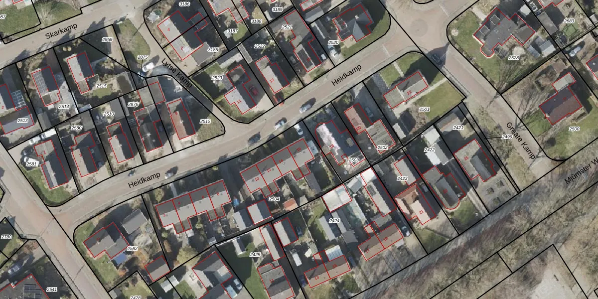 Het perceel waarop Heidkamp 16 staat heeft een oppervlakte van 1555 m². Dit is een zeer groot perceel. De perceeloppervlakte wordt geregistreerd door het Kadaster. Gedetailleerde informatie over de maten van dit perceel kunt u vinden in het rapport Kadastrale kaart met maatvoering van Heidkamp 16.