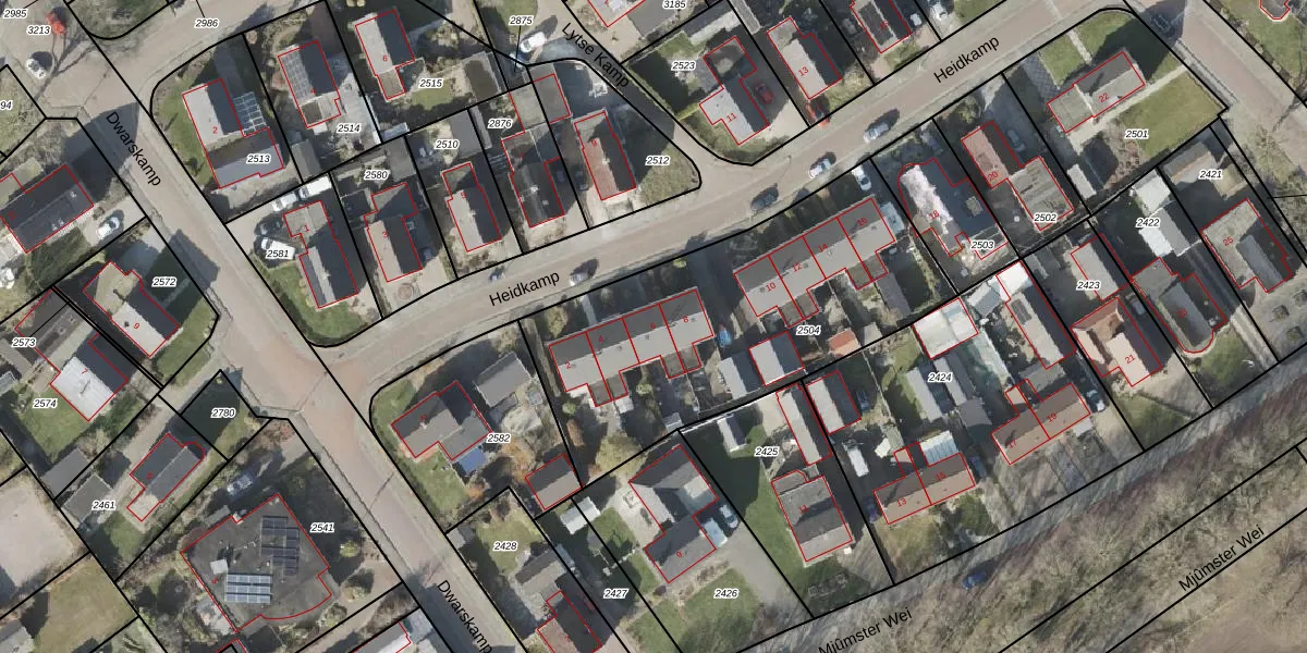 Het perceel waarop Heidkamp 6 staat heeft een oppervlakte van 1555 m². Dit is een zeer groot perceel. De perceeloppervlakte wordt geregistreerd door het Kadaster. Gedetailleerde informatie over de maten van dit perceel kunt u vinden in het rapport Kadastrale kaart met maatvoering van Heidkamp 6.