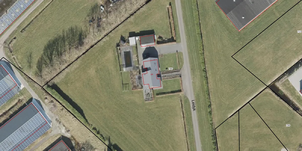 Het perceel waarop Leidyk 1-A staat heeft een oppervlakte van 1,9 ha. Dit is een zeer groot perceel. De perceeloppervlakte wordt geregistreerd door het Kadaster. Gedetailleerde informatie over de maten van dit perceel kunt u vinden in het rapport Kadastrale kaart met maatvoering van Leidyk 1-A.