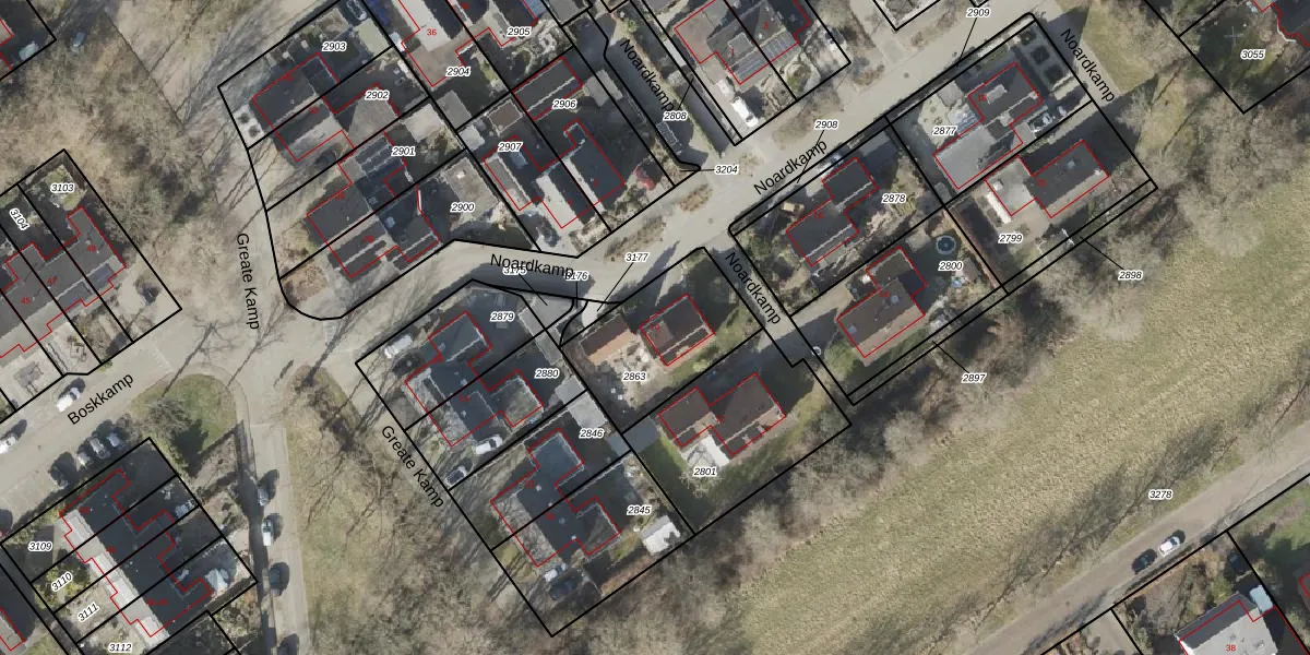 Het perceel waarop Noardkamp 10 staat heeft een oppervlakte van 428 m². Dit is een groot perceel. De perceeloppervlakte wordt geregistreerd door het Kadaster. Gedetailleerde informatie over de maten van dit perceel kunt u vinden in het rapport Kadastrale kaart met maatvoering van Noardkamp 10.