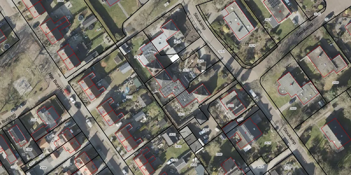Het perceel waarop Stoukamp 15 staat heeft een oppervlakte van 638 m². Dit is een groot perceel. De perceeloppervlakte wordt geregistreerd door het Kadaster. Gedetailleerde informatie over de maten van dit perceel kunt u vinden in het rapport Kadastrale kaart met maatvoering van Stoukamp 15.