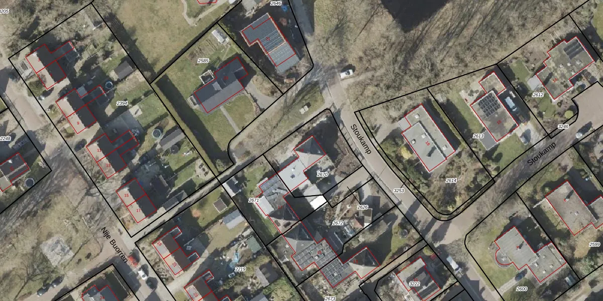 Het perceel waarop Stoukamp 19 staat heeft een oppervlakte van 540 m². Dit is een groot perceel. De perceeloppervlakte wordt geregistreerd door het Kadaster. Gedetailleerde informatie over de maten van dit perceel kunt u vinden in het rapport Kadastrale kaart met maatvoering van Stoukamp 19.