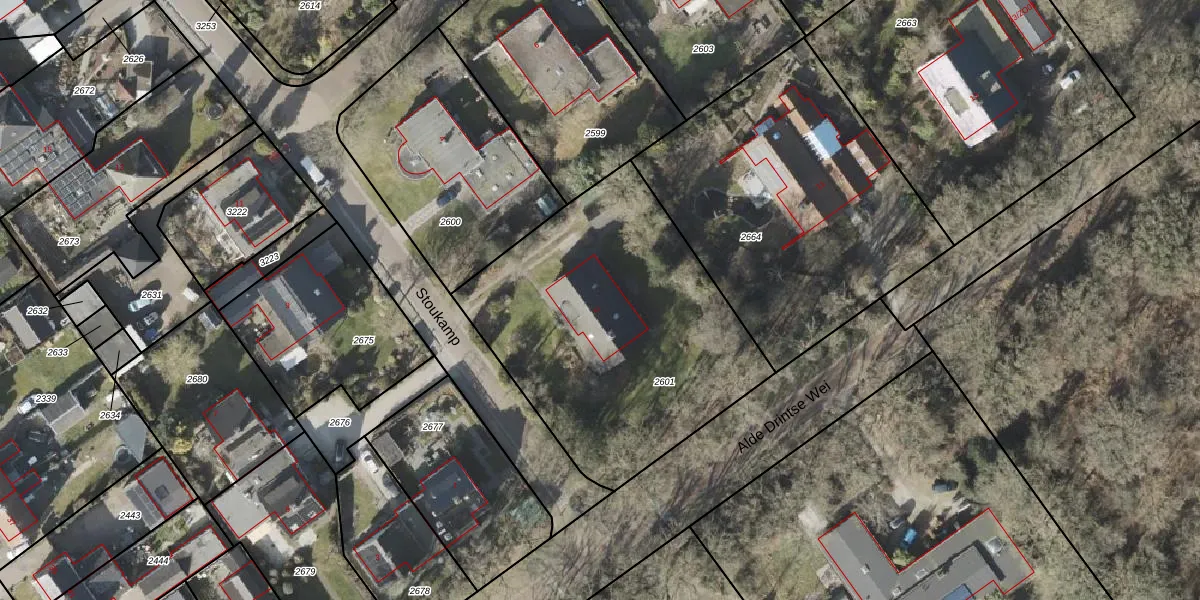 Het perceel waarop Stoukamp 2 staat heeft een oppervlakte van 1559 m². Dit is een zeer groot perceel. De perceeloppervlakte wordt geregistreerd door het Kadaster. Gedetailleerde informatie over de maten van dit perceel kunt u vinden in het rapport Kadastrale kaart met maatvoering van Stoukamp 2.