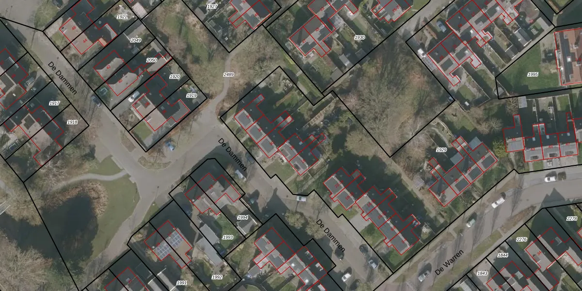 Het perceel waarop De Dammen 28 staat heeft een oppervlakte van 5637 m². Dit is een zeer groot perceel. De perceeloppervlakte wordt geregistreerd door het Kadaster. Gedetailleerde informatie over de maten van dit perceel kunt u vinden in het rapport Kadastrale kaart met maatvoering van De Dammen 28.