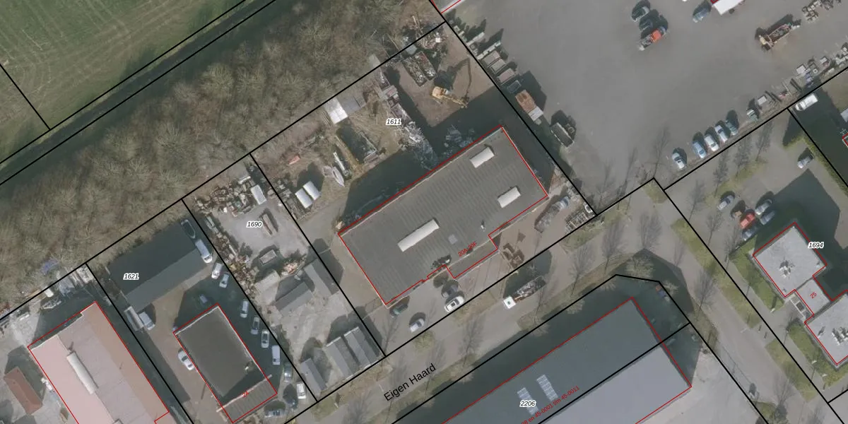 Het perceel waarop Eigen Haard 20-B staat heeft een oppervlakte van 3350 m². Dit is een zeer groot perceel. De perceeloppervlakte wordt geregistreerd door het Kadaster. Gedetailleerde informatie over de maten van dit perceel kunt u vinden in het rapport Kadastrale kaart met maatvoering van Eigen Haard 20-B.
