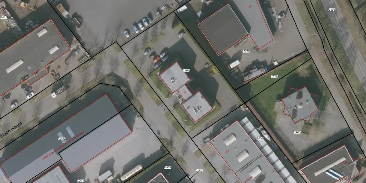 Het perceel waarop Eigen Haard 25 staat heeft een oppervlakte van 2220 m². Dit is een zeer groot perceel. De perceeloppervlakte wordt geregistreerd door het Kadaster. Gedetailleerde informatie over de maten van dit perceel kunt u vinden in het rapport Kadastrale kaart met maatvoering van Eigen Haard 25.