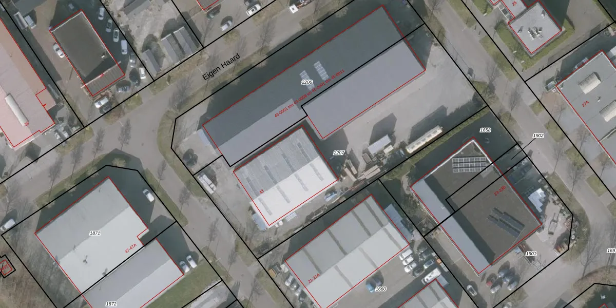 Het perceel waarop Eigen Haard 43 staat heeft een oppervlakte van 2912 m². Dit is een zeer groot perceel. De perceeloppervlakte wordt geregistreerd door het Kadaster. Gedetailleerde informatie over de maten van dit perceel kunt u vinden in het rapport Kadastrale kaart met maatvoering van Eigen Haard 43.