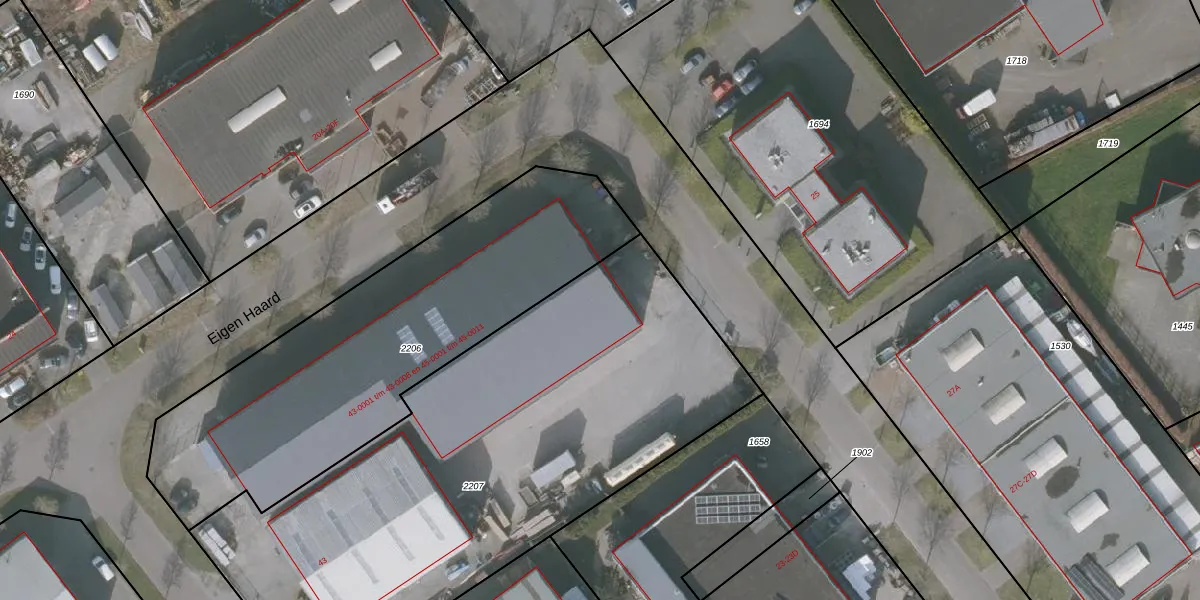 Het perceel waarop Eigen Haard 43-0001 staat heeft een oppervlakte van 2912 m². Dit is een zeer groot perceel. De perceeloppervlakte wordt geregistreerd door het Kadaster. Gedetailleerde informatie over de maten van dit perceel kunt u vinden in het rapport Kadastrale kaart met maatvoering van Eigen Haard 43-0001.