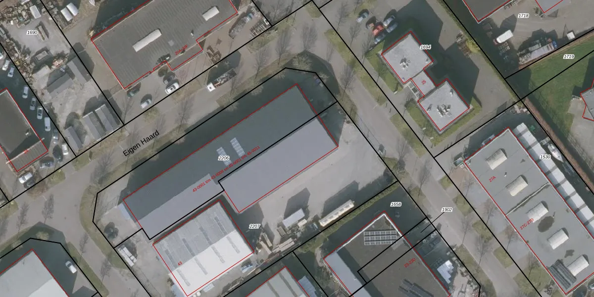 Het perceel waarop Eigen Haard 43-0003 staat heeft een oppervlakte van 2912 m². Dit is een zeer groot perceel. De perceeloppervlakte wordt geregistreerd door het Kadaster. Gedetailleerde informatie over de maten van dit perceel kunt u vinden in het rapport Kadastrale kaart met maatvoering van Eigen Haard 43-0003.