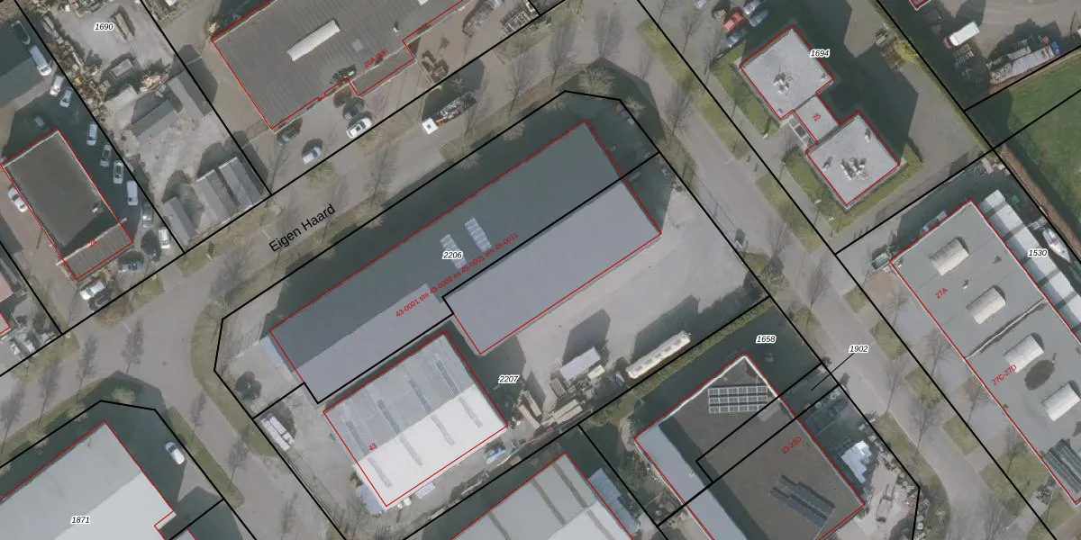 Het perceel waarop Eigen Haard 43-0005 staat heeft een oppervlakte van 2912 m². Dit is een zeer groot perceel. De perceeloppervlakte wordt geregistreerd door het Kadaster. Gedetailleerde informatie over de maten van dit perceel kunt u vinden in het rapport Kadastrale kaart met maatvoering van Eigen Haard 43-0005.