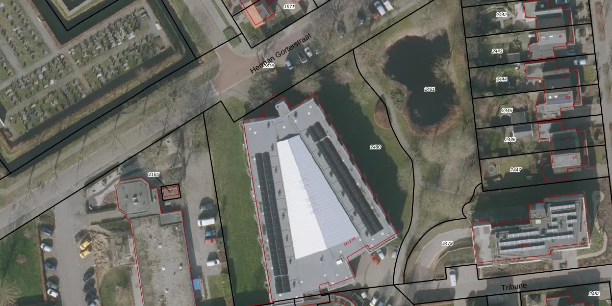 Het perceel waarop Tribune 110 staat heeft een oppervlakte van 4090 m². Dit is een zeer groot perceel. De perceeloppervlakte wordt geregistreerd door het Kadaster. Gedetailleerde informatie over de maten van dit perceel kunt u vinden in het rapport Kadastrale kaart met maatvoering van Tribune 110.