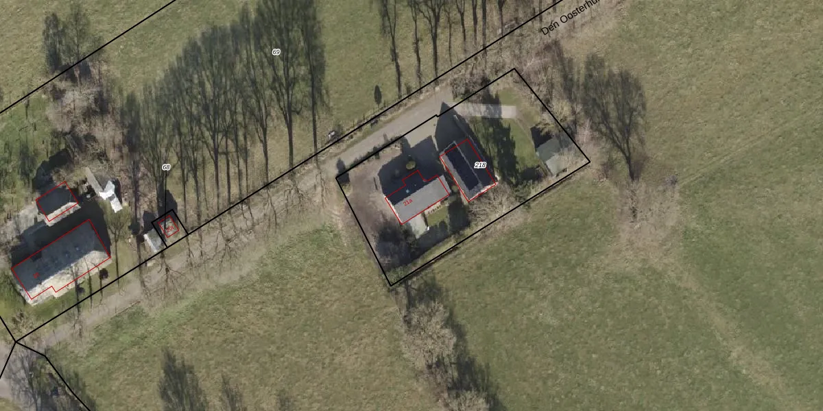 Het perceel waarop Den Oosterhuis 21-a staat heeft een oppervlakte van 1575 m². Dit is een zeer groot perceel. De perceeloppervlakte wordt geregistreerd door het Kadaster. Gedetailleerde informatie over de maten van dit perceel kunt u vinden in het rapport Kadastrale kaart met maatvoering van Den Oosterhuis 21-a.