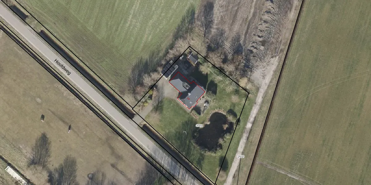 Het perceel waarop Hoofdweg 19 staat heeft een oppervlakte van 2405 m². Dit is een zeer groot perceel. De perceeloppervlakte wordt geregistreerd door het Kadaster. Gedetailleerde informatie over de maten van dit perceel kunt u vinden in het rapport Kadastrale kaart met maatvoering van Hoofdweg 19.