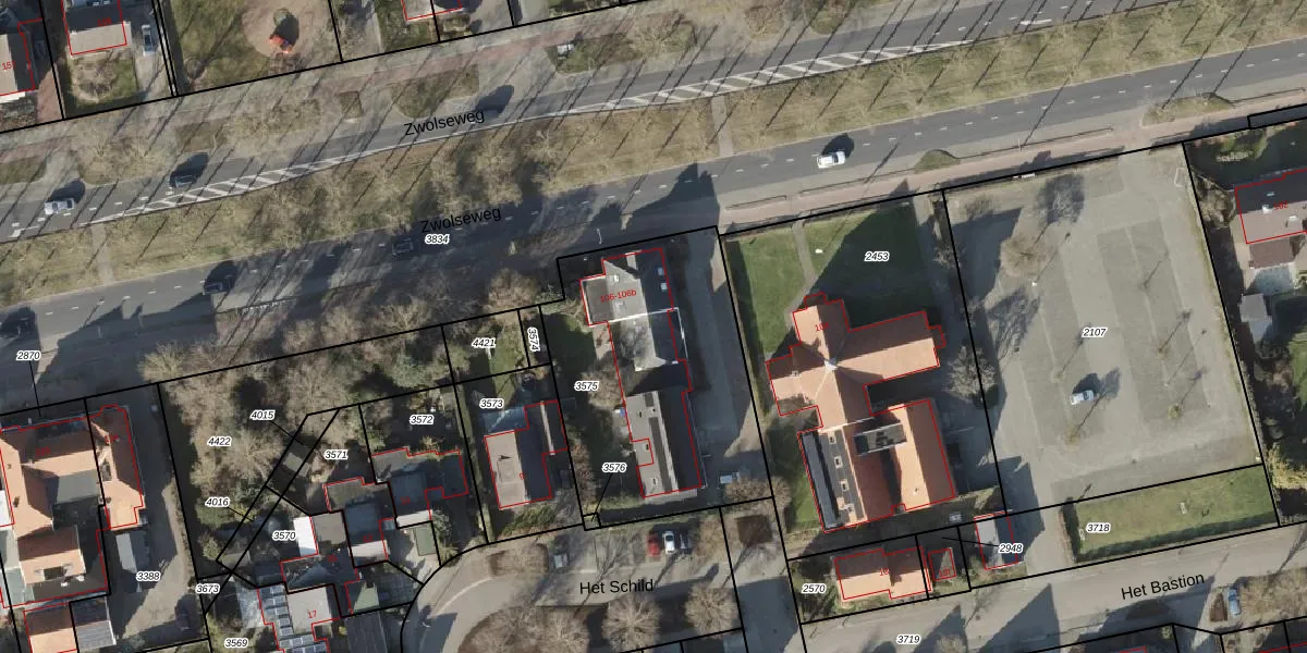 Het perceel waarop Zwolseweg 106-a staat heeft een oppervlakte van 1205 m². Dit is een zeer groot perceel. De perceeloppervlakte wordt geregistreerd door het Kadaster. Gedetailleerde informatie over de maten van dit perceel kunt u vinden in het rapport Kadastrale kaart met maatvoering van Zwolseweg 106-a.